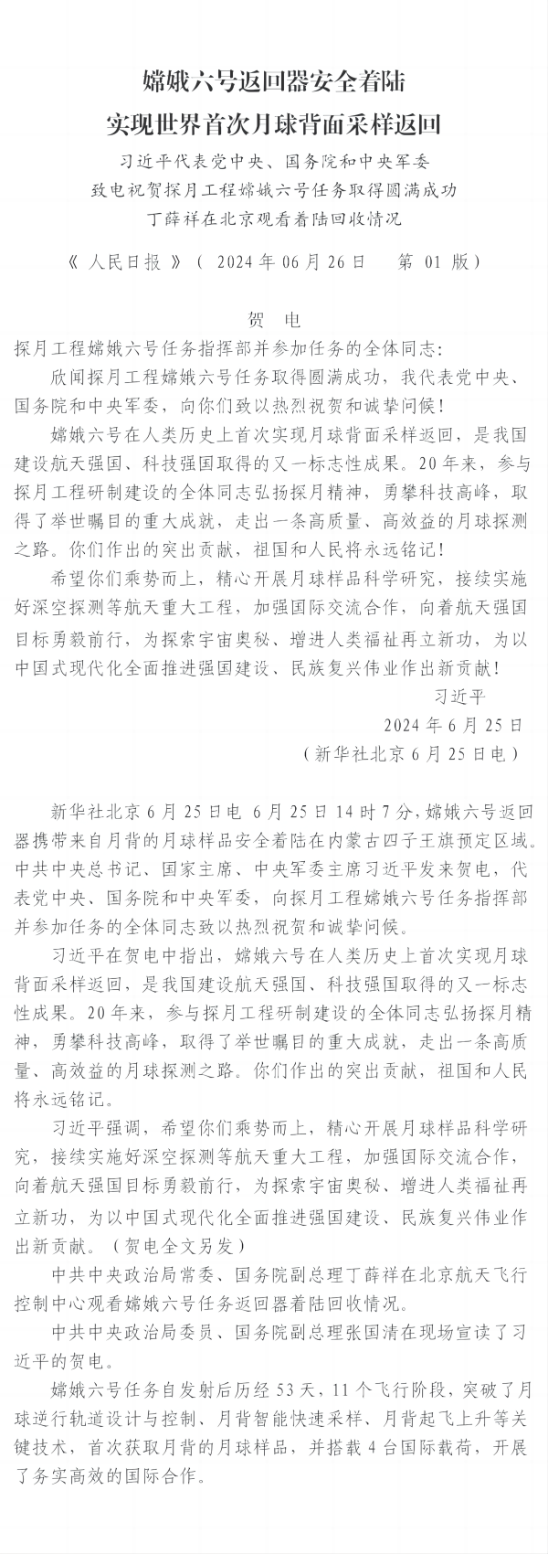 嫦娥六號(hào)返回器安全著陸 實(shí)現(xiàn)世界首次月球背面采樣返回