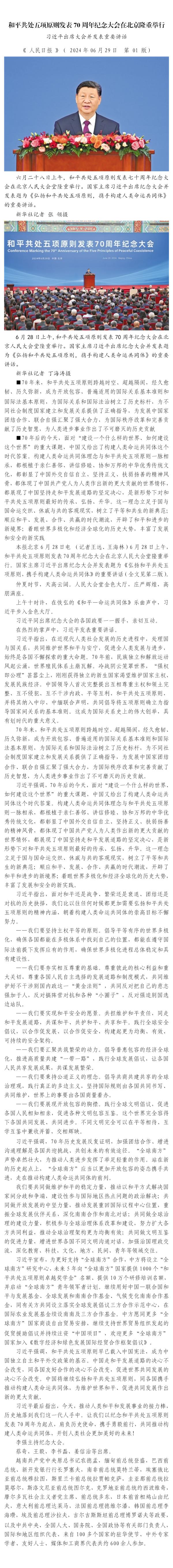 和平共處五項原則發(fā)表70周年紀念大會在北京隆重舉行 習近平出席大會并發(fā)表重要講話