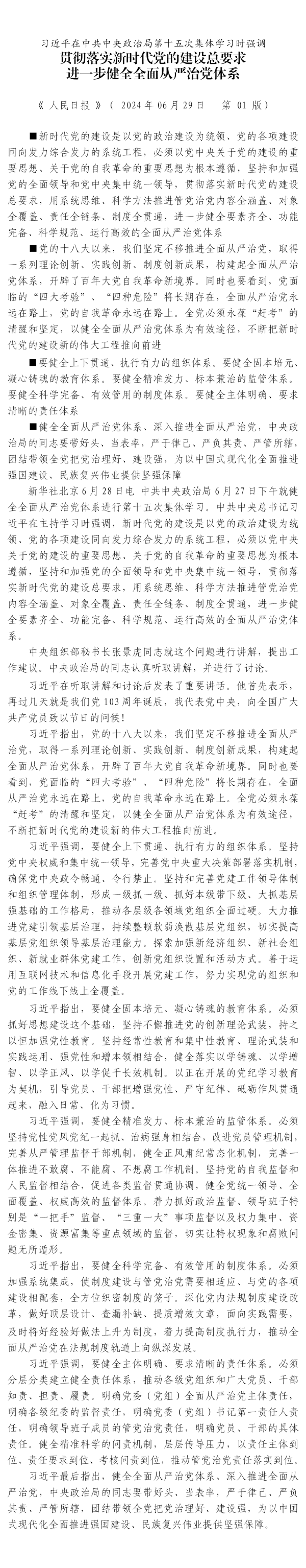習(xí)近平在中共中央政治局第十五次集體學(xué)習(xí)時強(qiáng)調(diào) 貫徹落實新時代黨的建設(shè)總要求 進(jìn)一步健全全面從嚴(yán)治黨體系