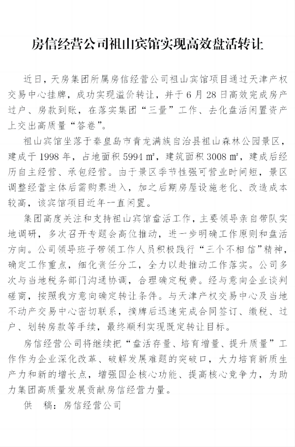 房信經(jīng)營(yíng)公司祖山賓館實(shí)現(xiàn)高效盤(pán)活轉(zhuǎn)讓