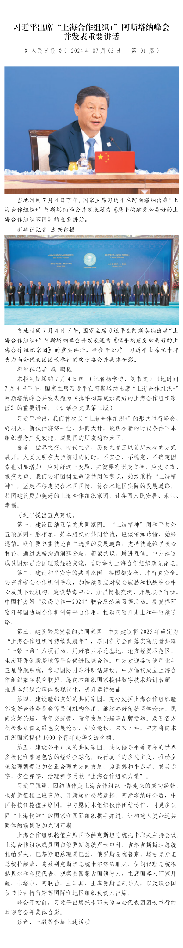 習近平出席“上海合作組織+”阿斯塔納峰會 并發(fā)表重要講話