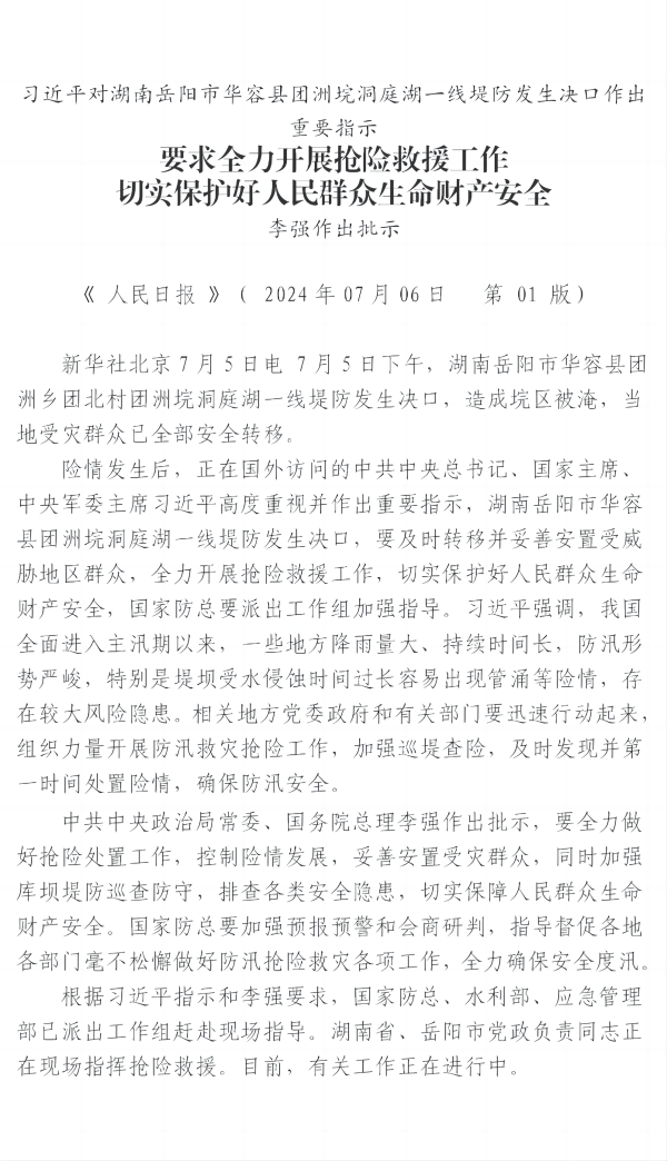 習(xí)近平對湖南岳陽市華容縣團洲垸洞庭湖一線堤防發(fā)生決口作出重要指示 要求全力開展搶險救援工作 切實保護好人民群眾生命財產(chǎn)安全 李強作出批示