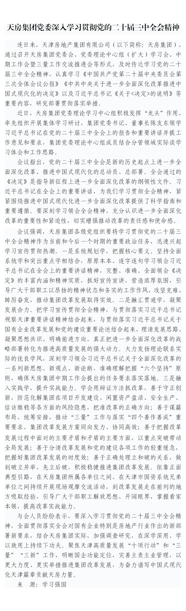 天房集團黨委深入學習貫徹黨的二十屆三中全會精神