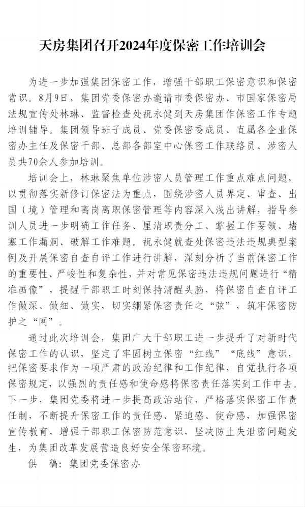 天房集團(tuán)召開(kāi)2024年度保密工作培訓(xùn)會(huì)