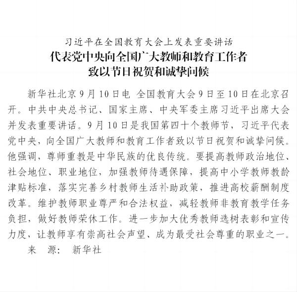 習(xí)近平在全國教育大會(huì)上發(fā)表重要講話 代表黨中央向全國廣大教師和教育工作者 致以節(jié)日祝賀和誠摯問候