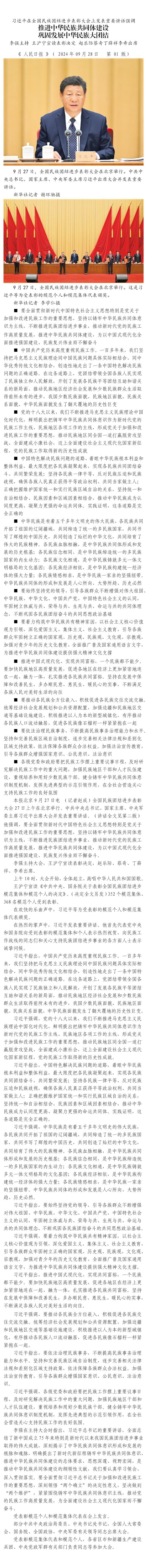 習近平在全國民族團結進步表彰大會上發(fā)表重要講話強調 推進中華民族共同體建設 鞏固發(fā)展中華民族大團結 李強主持 王滬寧宣讀表彰決定 趙樂際蔡奇丁薛祥李希出席