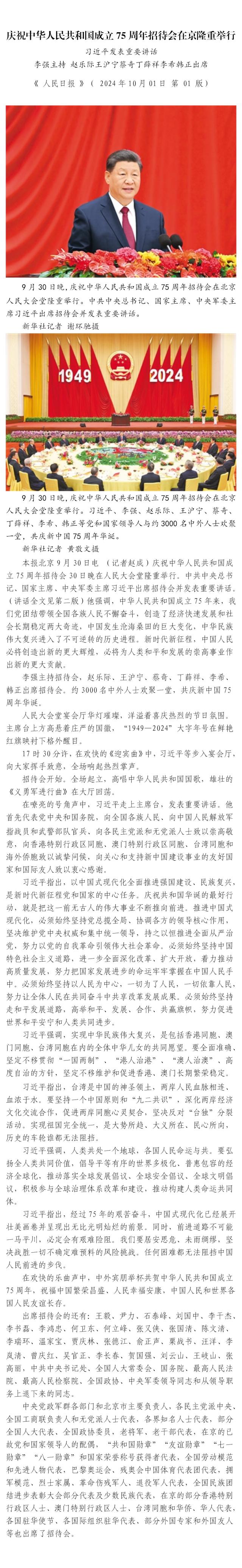 慶祝中華人民共和國成立75周年招待會在京隆重舉行