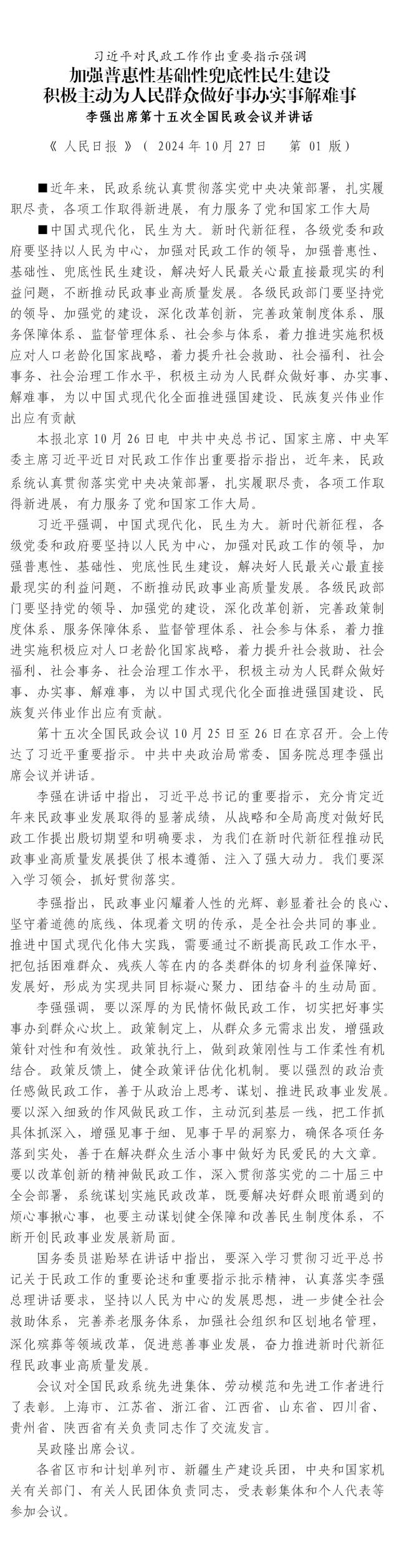 習(xí)近平對(duì)民政工作作出重要指示強(qiáng)調(diào) 加強(qiáng)普惠性基礎(chǔ)性兜底性民生建設(shè) 積極主動(dòng)為人民群眾做好事辦實(shí)事解難事 李強(qiáng)出席第十五次全國(guó)民政會(huì)議并講話