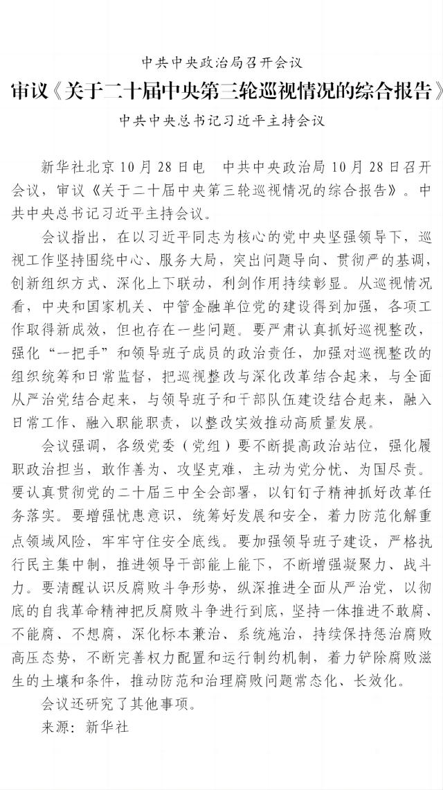 中共中央政治局召開會議 審議《關(guān)于二十屆中央第三輪巡視情況的綜合報告》 中共中央總書記習(xí)近平主持會議
