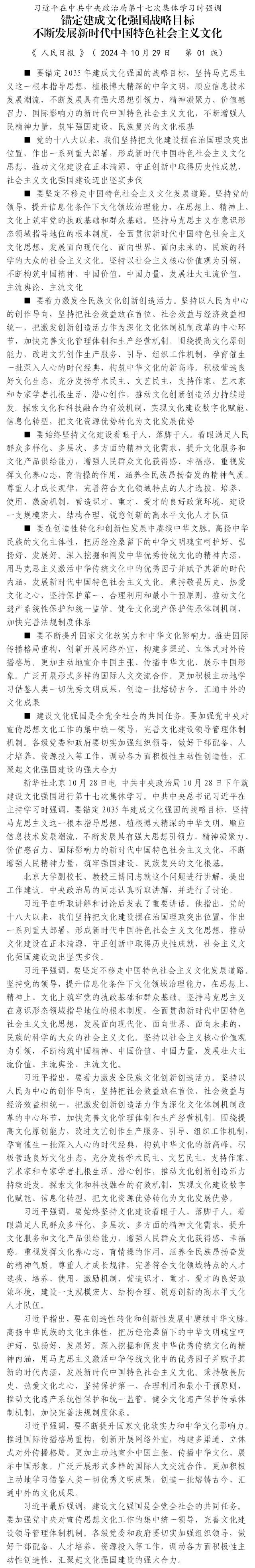 習近平在中共中央政治局第十七次集體學習時強調(diào) 錨定建成文化強國戰(zhàn)略目標 不斷發(fā)展新時代中國特色社會主義文化