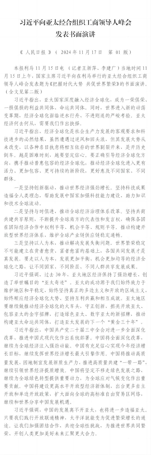 習(xí)近平向亞太經(jīng)合組織工商領(lǐng)導(dǎo)人峰會發(fā)表書面演講