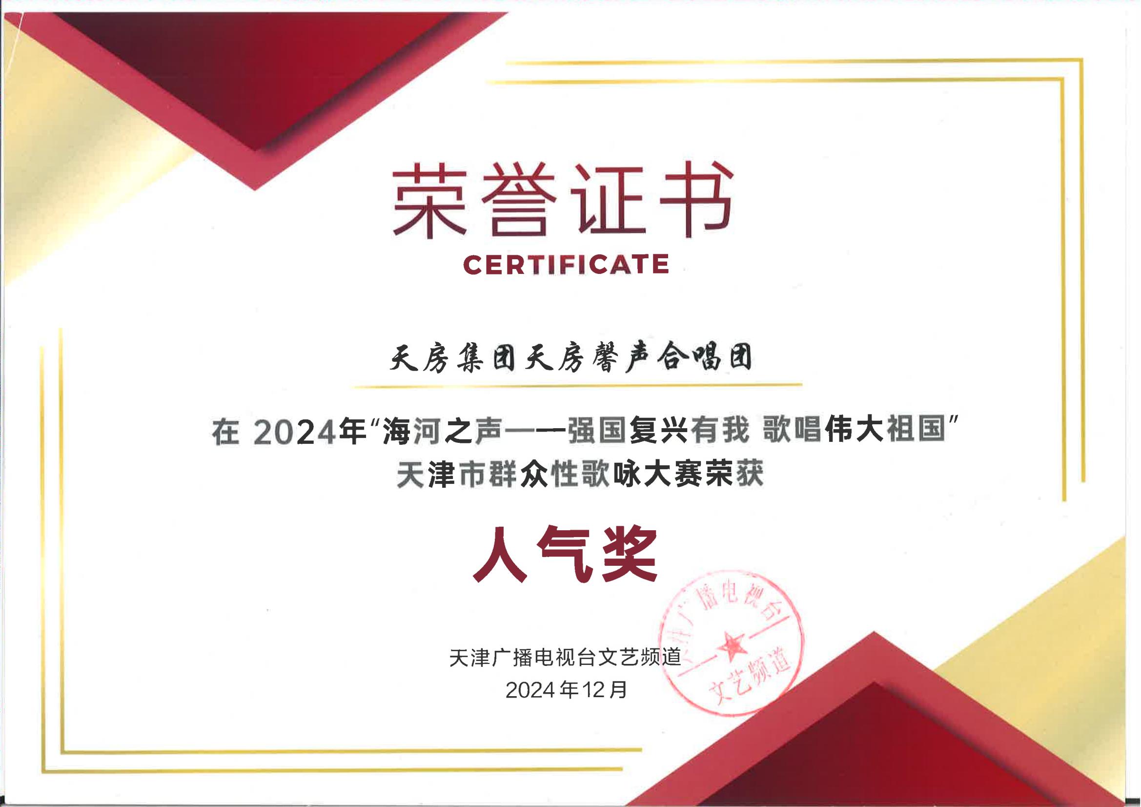 “海河之聲——強國復(fù)興有我 歌唱偉大祖國”天津市群眾性歌詠大賽人氣獎