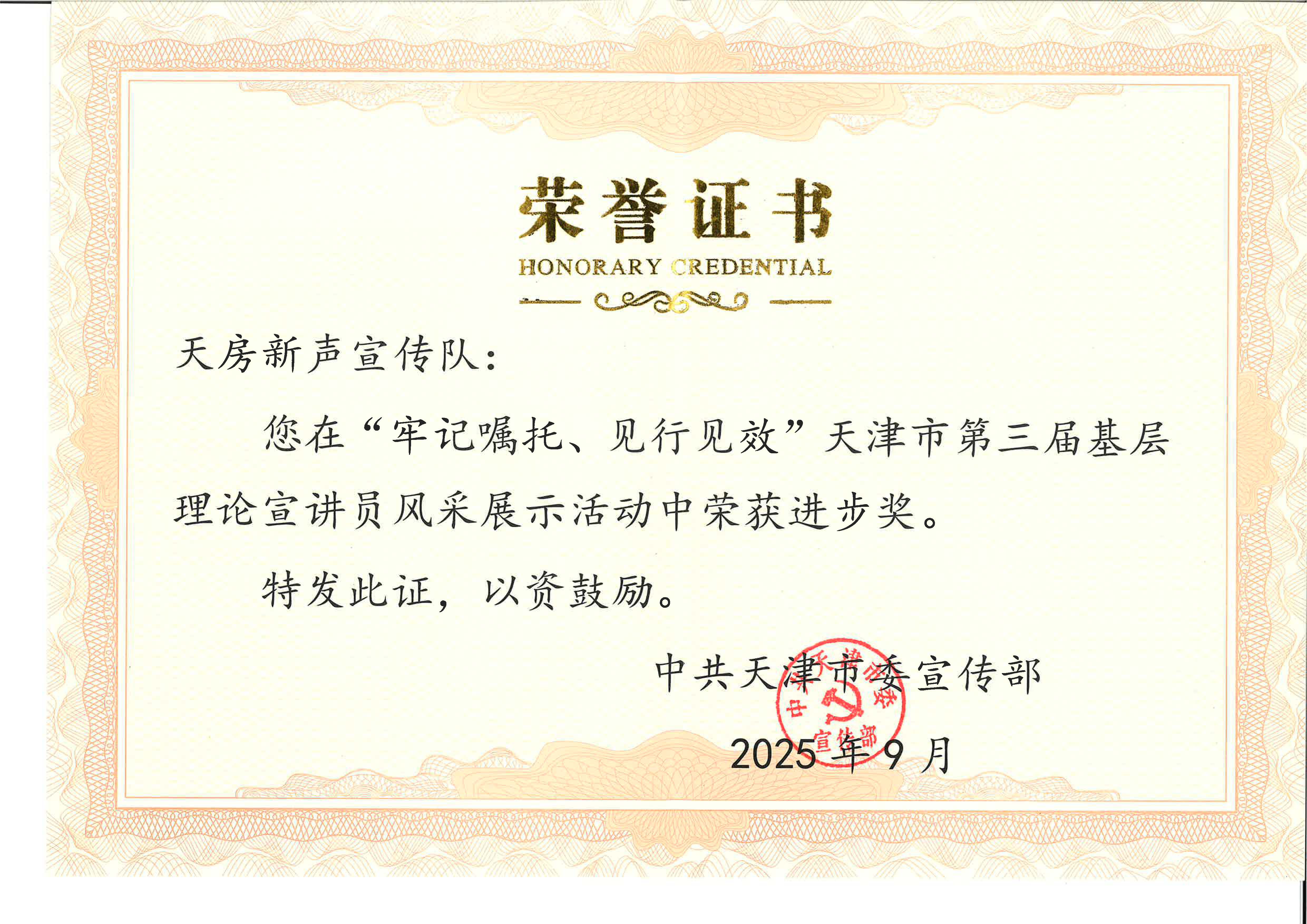 “牢記囑托、見行見效”天津市第三屆基層理論宣講員風(fēng)采展示活動進步獎